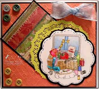 I’ve colored the image with Prismacolor pencils, added a few buttons, a bow and did a little faux stitching. I cut through the back of the card and pulled some blue ribbon out and let it come down the front of the basket, just wish I’d let it go a little further now.
